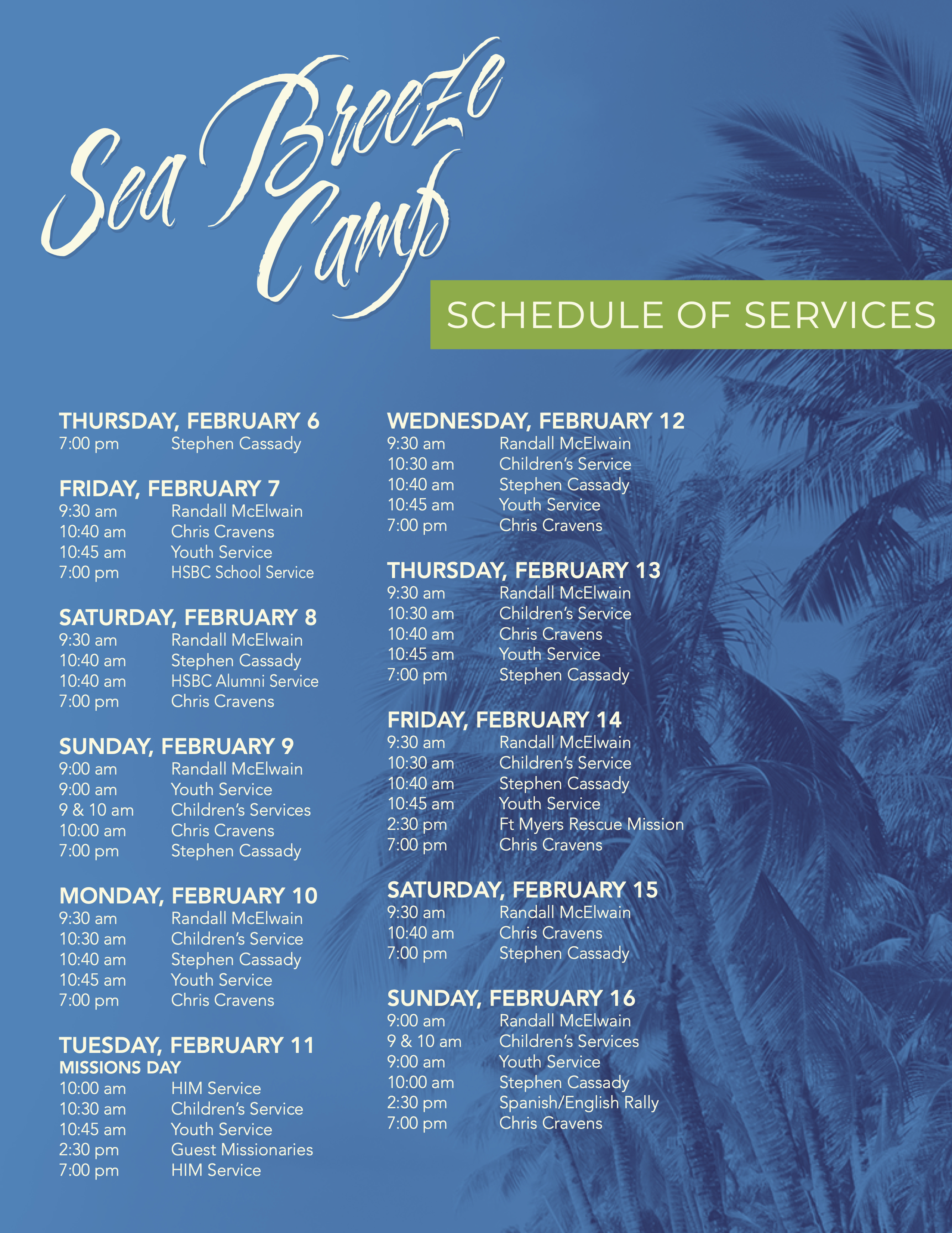 Previous ImageNext Image Camp Service Schedule Click on the image to View/Download the 2019 Camp Bulletin containing more camp information.