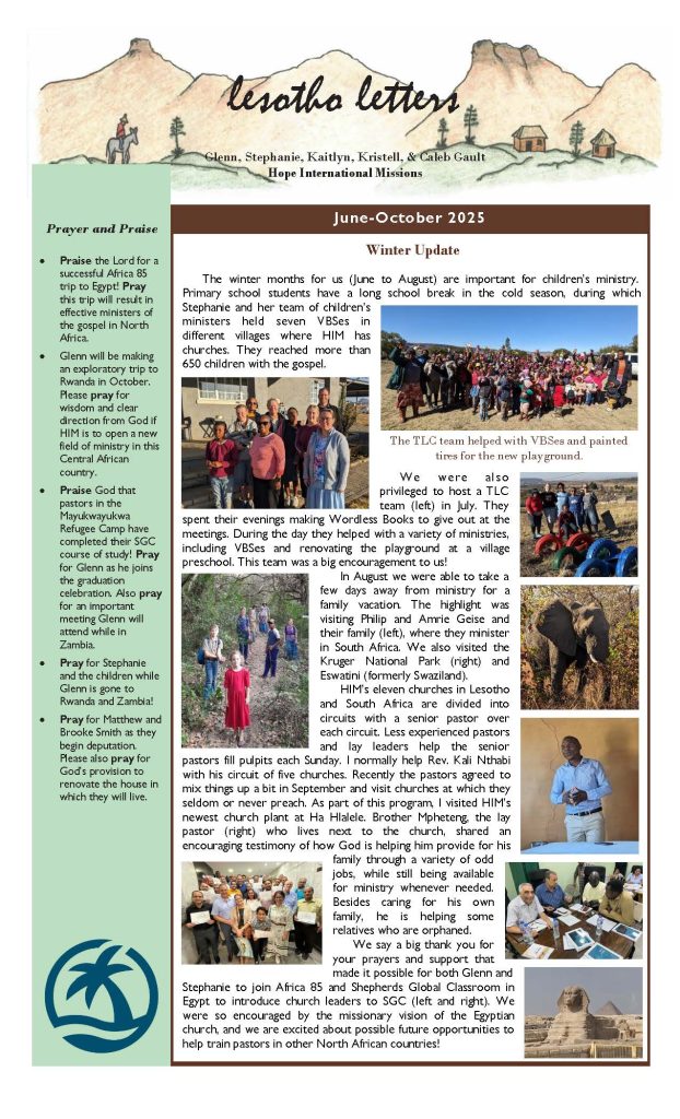 Glenn and Stephanie have been serving HIM in Lesotho, Africa, since 2000. During their seventeen years there, God has blessed them with three children, Kaitlyn (2005), Kristell (2009), and Caleb (2014). The focus of their ministry has been training leaders to plant new churches, helping with children’s ministry, distributing Bibles, and coordinating humanitarian projects, including Matukeng Health Centre and a growing orphan ministry.