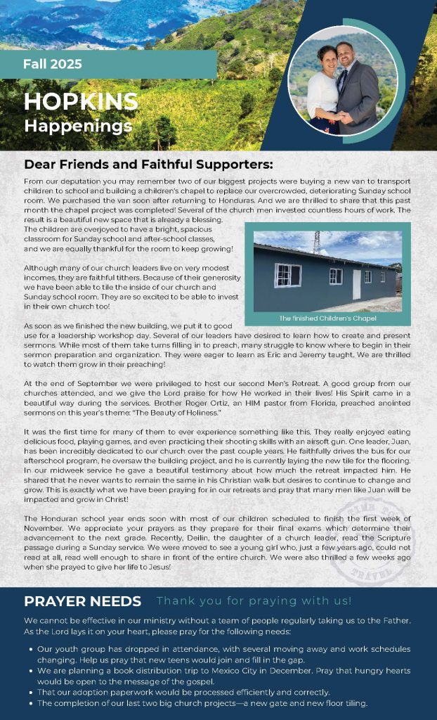 “Your prayer and financial partnership in the Great Commission will enable us to fulfill God’s calling on our lives to go and make disciples in Honduras. Thank you for your support!”