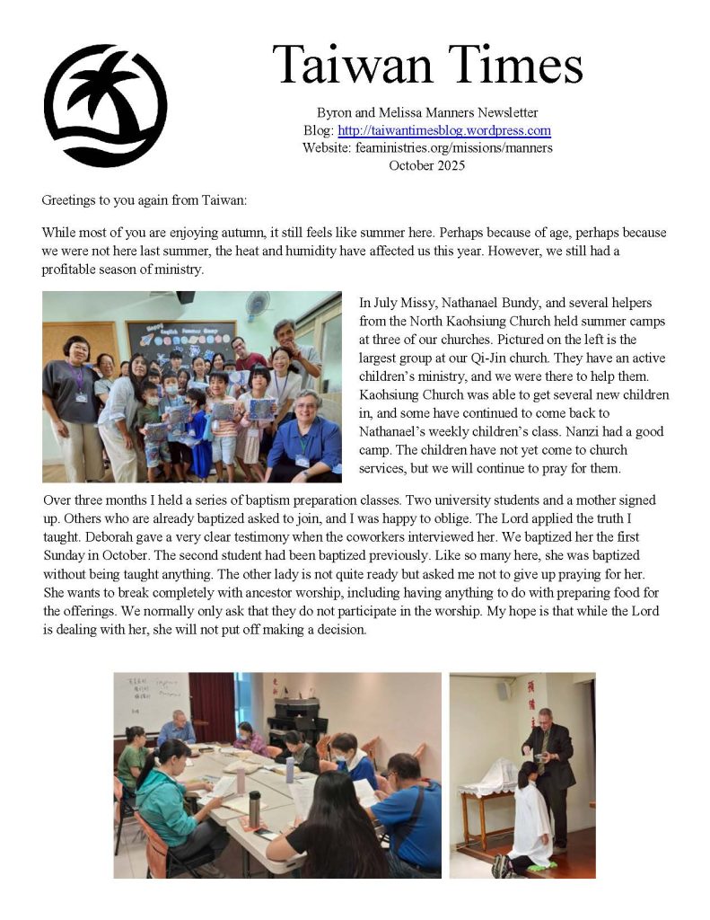 After a few years of ministry at the Tsoying Bible Holiness Church, God gave Byron a three-part vision for what needed to be done at the church. The first step was to organize the church by writing a constitution and bylaws. The second step was to buy their own building in order to have a permanent location. This was accomplished in 2016. They moved into an eighteen floor office building in a different district in the city, so the name of the church had to change. When they moved in August of 2016, the Tsoying church ceased to exist and became the North Kaohsiung Bible Holiness Church. The Manners are currently working on gaining official government recognition for the church and returning money they borrowed from several in the congregation. The last step of the vision is to find and train a Taiwanese couple to take over and lead the church.
