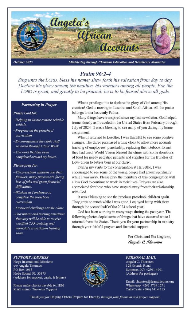 “Thank you for partnering with me through prayer and finances to Help Others Prepare for Eternity in Lesotho.”